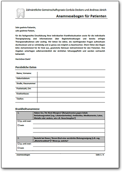 Vor Ihrem ersten Besuch in unserer Praxis und immer bei wesentlichen medizinischen Veränderungen bitten wir Sie, einen Anamnesebogen auszufüllen, um wichtige medizinische Informationen erfassen zu können. Sie können diesen Anamnesebogen hier herunterladen und vor Ihrem Besuch bei uns bequem zuhause ausfüllen.